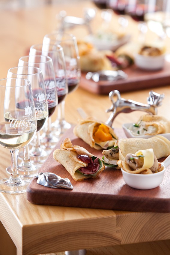 The pairing includes Flat Roof Manor Pinot Grigio matched with a spicy Thai green-curry pancake; Uitkyk Chardonnay with a slow-roasted pumpkin and brie pancake; Flat Roof Manor Merlot with a roast chicken, camembert and sage pancake; Flat Roof Manor Shiraz Mourvèdre Viognier with a roast beef, baby spinach and cranberry jelly pancake; and finally, Uitkyk Shiraz Cabernet Sauvignon, with a pancake of sautéed onion, mushroom and Edam cheese.